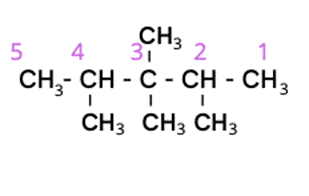Krok 2: Zwróć uwagę na podstawniki metylowe. Chcemy, by miał one jak najmniejsze lokanty. Atomy węgla numerujemy tak, by podstawniki były jak najbliżej pierwszego atomu węgla. Podstawniki metylowe są zatem przy drugim, trzecim i czwartym atomie węgla.