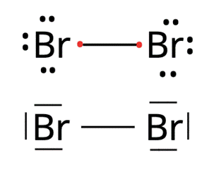 W pierwszym kroku zapisz wzór cząsteczki bromu – Br2. Brom ma siedem elektronów walencyjnych. Do uzyskania oktetu elektronowego brakuje mu jednego elektronu. Elektron ten może zostać uwspólniony pomiędzy atomami bromu, co powoduje powstanie wiązania kowalencyjnego niespolaryzowanego. Elektrony walencyjne, które nie biorą udziału w wiązaniu, tworzą pary niewiążące (dwa elektrony to jedna para). Na czerwono zaznaczono elektrony wiążące, a na czarno – niewiążące. Czarne kreski to pary elektronów niewiążących. Jest ich sześć.