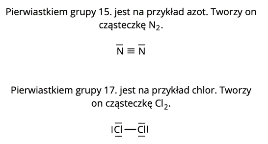 Aby zapisać wzory cząsteczek, spójrz do układu okresowego. Należy wybrać jeden pierwiastek grupy 15. (na przykład azot) i jeden pierwiastek grupy 17. (na przykład chlor). Zarówno azot, jak i chlor, dążą do oktetu elektronowego. Atomom azotu brakuje trzech elektronów, a atomom chloru – jednego. Stąd tworzą między sobą odpowiednio trzy i jedno wiązanie.