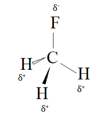 Cząsteczka CH3F ma przestrzenną budowę tetraedru, dlatego gdzie wodór i fluor w wyniku wzajemnego położenia i różnic w elektroujemności stają się biegunami elektrycznymi.