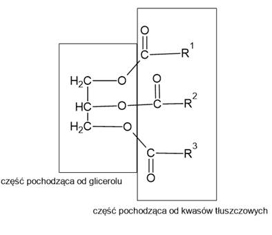 W strukturze tłuszczów można wyodrębnić część pochodzącą od glicerolu i część pochodzącą od kwasów tłuszczowych, ponieważ tłuszcze otrzymywane są w reakcji glicerolu z kwasami tłuszczowymi.