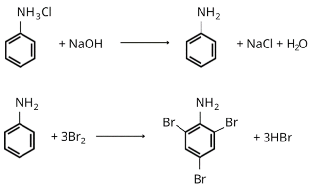 Następnie sól ta reaguje z wodorotlenkiem sodu. Powstaje anilina – produktami ubocznymi są chlorek sodu i woda.