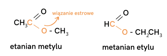 Wiedząc, że nasz ester ma trzy atomy węgla wiemy, że powstał z substratów, które mają odpowiednio jeden i dwa atomy węgla w cząsteczkach – metanol + kwas etanowy lub etanol + kwas metanowy.