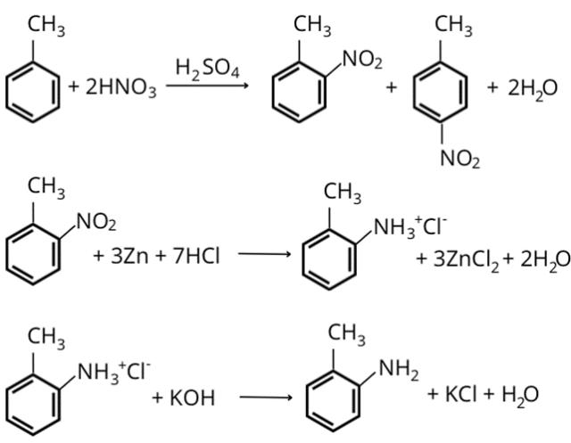 Krok 1: Nitrowanie toluenu, czyli metylobenzenu. Mieszaninę nitrującą stanowi kwas azotowy(V) i siarkowy(VI). W wyniku tej reakcji powstają nitropochodne toluenu. Grupa metylowa w toluenie to podstawnik I rodzaju, więc kieruje grupy nitrowe w pozycje orto (2) i para (4). Produktem ubocznym tej reakcji jest woda. Do naszej reakcji wykorzystamy tylko pochodną orto.