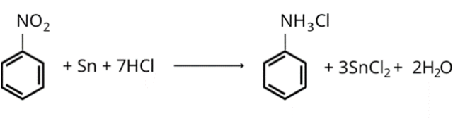 Nitrobenzen reaguje z cyną i kwasem solnym dając chlorek anilinowy – produktami ubocznymi są chlorek cyny i woda: