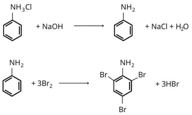 Następnie sól ta reaguje z wodorotlenkiem sodu. Powstaje anilina – produktami ubocznymi są chlorek sodu i woda.