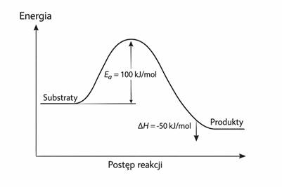 Sporządź w zeszycie wykres przedstawiający przebieg zmian energii dla reakcji, w której energia aktywacji wynosi 100 kJ/mol, a zmiana entalpii ΔH = −50 kJ/mol.