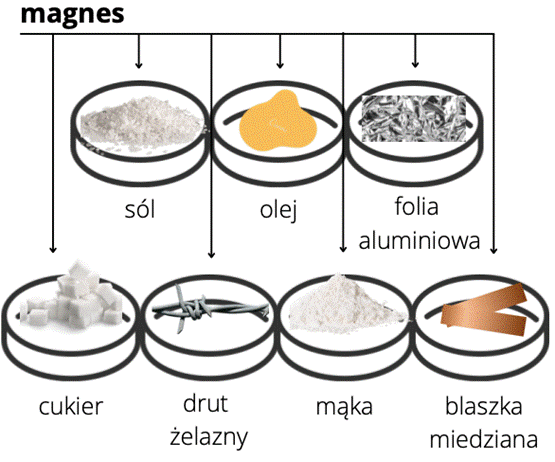 Obserwacje: Po przyłożeniu magnesu do żelaznego drutu, dochodzi do ich złączenia. Przyłożenie magnesu do soli, oleju, folii aluminiowej, cukru, mąki i blaszki miedzianej nie wywołało takiego zjawiska.