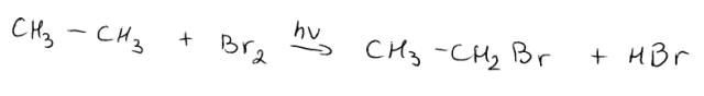 Substytucja halogenu pod wpływem światła: Do łańcucha alkanu jest przyłączany atom fluorowca a jako produkt uboczny reakcji powstaje wodorek halogenu. Następuje wymiana wodoru z łańcucha za halogen.