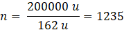 Zaczynamy od obliczenia masy cząsteczkowej jednej cząsteczki reszty glukozowej, 162 g/mol. Następnie liczmy liczbę moli, czyli n. 200 000 u dzielimy na 162 u i wychodzi nam, że przeciętnie jedna cząsteczka skrobi składa się z 1235 reszt glukozowych.