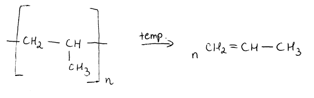 Polipropylen zbudowany jest z cząsteczek propenu, które uwalniają się pod wpływem temperatury. Aby zapisać równanie depolimeryzacji zapisujemy ogólny wzór polimeru – rysujemy wzór cząsteczki wyjściowej i „rozrywając” jej wiązanie podwójne tworzymy wiązania wychodzące poza nawias. Będzie to nasz jeden mer, który powielamy wielokrotnie (w naszym przypadku n razy).