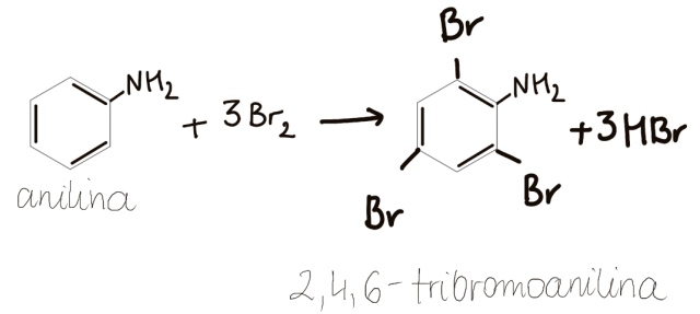 Zaobserwujemy odbarwienie wody bromowej oraz powstanie białego osadu. Po umieszczeniu papierka uniwersalnego w kolbie zobaczymy zmianę zabarwienia z żółtej na czerwoną, co wskazuje na obecność bromowodoru. Anilina ulega reakcji bromowania, czyli substytucji elektrofilowej. Produktem reakcji jest 2,4,6-tribromoanilina.