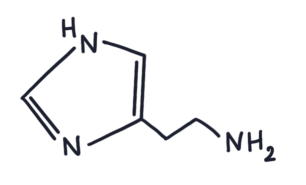Histamina to związek chemiczny będący aminą heterocykliczną z pięcioczłonowym pierścieniem z dwoma atomami azotu.