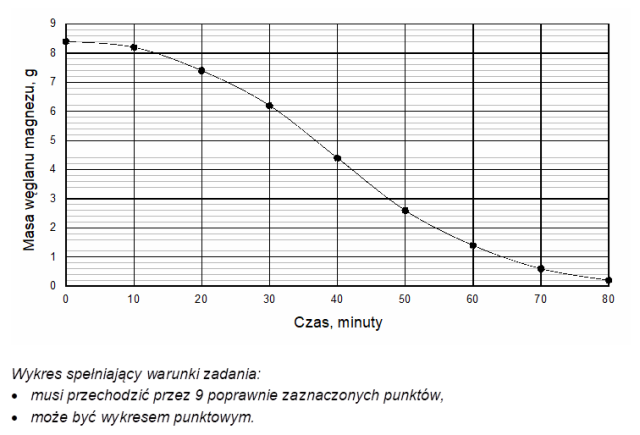 Zapoznaj się z informacjami zawartymi w treści zadania, a następnie na podstawie odpowiednich obliczeń uzupełnij tabelę i sporządź wykres zależności zmiany masy węglanu magnezu od czasu prowadzenia jego rozkładu termicznego.