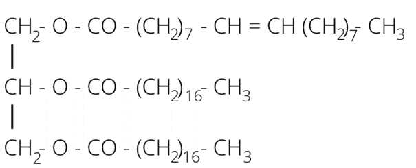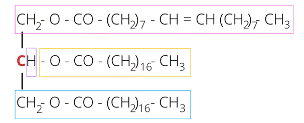 Cząsteczka szukanej substancji ma być chiralna. Oznacza to, że zawiera jeden atom węgla w cząsteczce połączony jest z czterema różnymi atomami lub grupami atomów. Chiralny atom węgla zaznaczono na czerwono. Podstawniki tego atomu zaznaczono w ramkach – zwróć uwagę, że są to cztery różne podstawniki. Kolejno od góry są: reszta kwasu oleinowego i dwie reszty kwasu stearynowego. Drugą opcją jest umieszczenie u góry reszty kwasu stearynowego, a na dole dwóch reszt kwasu oleinowego. Najważniejsze, by nie umieszczać tej samej reszty u góry i u dołu – wtedy podstawniki nie będą się różnić.