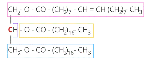 Cząsteczka szukanej substancji ma być chiralna. Oznacza to, że zawiera jeden atom węgla w cząsteczce połączony jest z czterema różnymi atomami lub grupami atomów. Chiralny atom węgla zaznaczono na czerwono. Podstawniki tego atomu zaznaczono w ramkach – zwróć uwagę, że są to cztery różne podstawniki. Kolejno od góry są: reszta kwasu oleinowego i dwie reszty kwasu stearynowego. Drugą opcją jest umieszczenie u góry reszty kwasu stearynowego, a na dole dwóch reszt kwasu oleinowego. Najważniejsze, by nie umieszczać tej samej reszty u góry i u dołu – wtedy podstawniki nie będą się różnić.