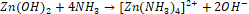 Po dodaniu wody amoniakalnej także powstają białe osady wodorotlenków, jednak tylko osad cynku częściowo rozpuszcza się w nadmiarze amoniaku, ponieważ Zn2+ tworzy rozpuszczalny kompleks amoniakalny: