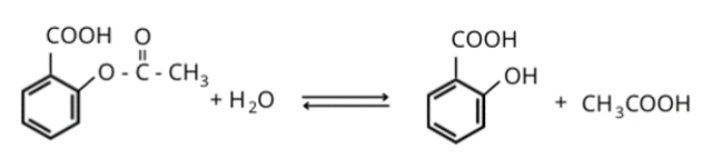 W tej reakcji powstaje kwas salicylowy i kwas octowy. Metodą pozwalającą na wykrycie kwasu salicylowego jest reakcja z chlorkiem żelaza(III). Obecność fenolu w związku wywoła fioletowo-niebieskie zabarwienie. Z kolei kwas octowy ma charakterystyczny, ostry zapach octu.