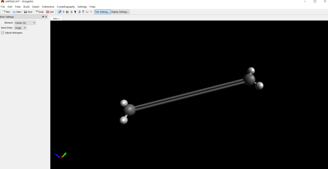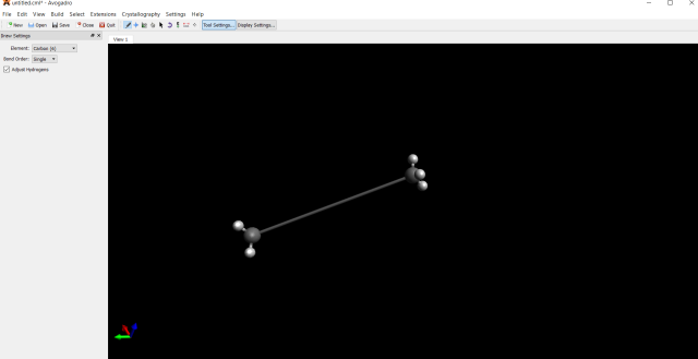 Przytrzymując lewy przycisk myszy, tworzymy od razu dwa atomy węgla, gdzie możemy określić jaka ma być odległość między nimi. Puszczamy lewy przycisk myszy, aby do atomów węgla dodały się automatycznie atomy wodoru.