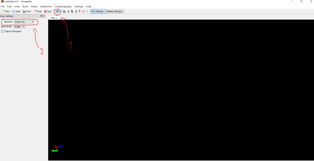 W programie, aby nanieść na pole robocze atomy węgla wybieramy z paska narzędzi ikonę ołówka (Draw Tool) a następnie w oknie bocznym Elements → Carbon (6):