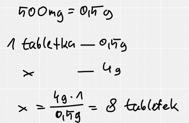 W tym zadaniu musisz obliczyć, ile tabletek leku przeciwbólowego w ciągu doby może przyjąć osoba dorosła, jeśli jedna tabletka zawiera 500 mg substancji czynnej, którą jest paracetamol.