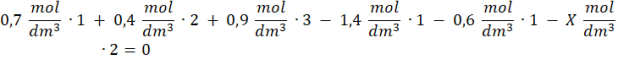 Dodajemy do siebie stężenia kationów i odejmujemy od nich zsumowane stężenie anionów. Pamiętamy, aby każde stężenie danego jonu przemnożyć przez jego ładunek. W naszym przypadku otrzymujemy równanie z niewiadomą, które po rozwiązaniu zwraca szukaną wartość stężenia jonów siarczanowych (VI).