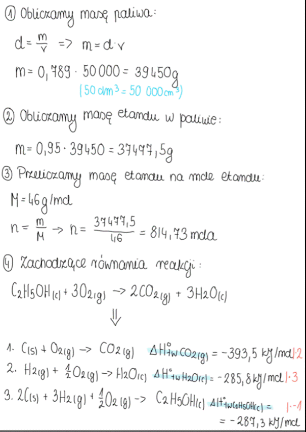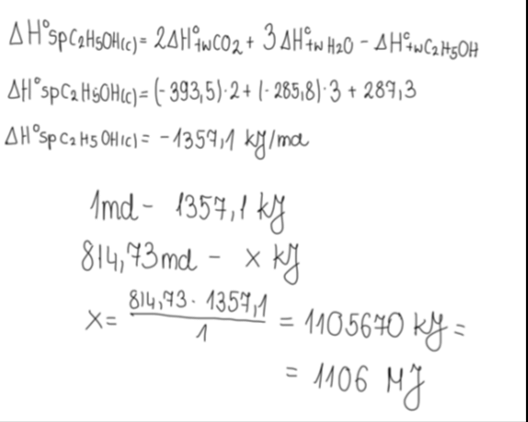 Oblicz, ile energii w postaci ciepła (w MJ) można uzyskać w warunkach standardowych przy całkowitym spaleniu etanolu zawartego w 50 dm³ paliwa, które ma 95% masowych etanolu i gęstość 0,789 g•cm³.Wykorzystaj standardowe entalpie tworzenia: gazowego tlenku węgla (IV) (-393,5 kJ•mol⁻¹), ciekłej wody (-285,8 kJ•mol⁻¹) i ciekłego etanolu (-287,3 kJ•mol⁻¹). Wynik podaj w zaokrągleniu do liczb całkowitych.