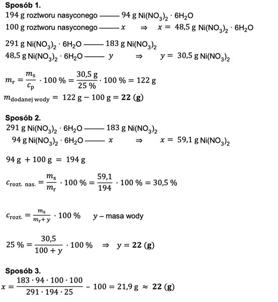 Oblicz, ile wody musisz dodać do 100 g roztworu nasyconego w 20°C, żeby uzyskać roztwór o stężeniu 25,0%, i zaokrąglij wynik do jedności.
