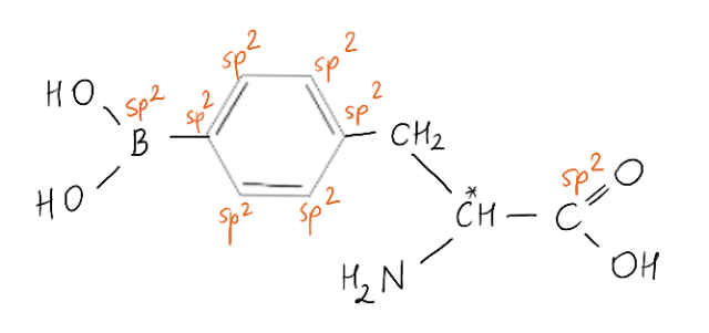 Atomy o hybrydyzacji sp2 to atomy węgla występujące w pierścieniu aromatycznym, atom boru oraz atom węgla w grupie karboksylowej (-COOH).