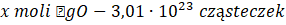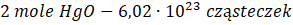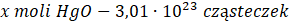 Stechiometrycznie z rozkładu 2 moli HgO otrzymuje się 1 mol tlenu, czyli 6,02 ∙ 1023 cząsteczek, więc 3,01 ∙ 1023 cząsteczek otrzymuje się z x moli HgO: