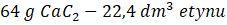 Stechiometrycznie z 1 mola karbidu można otrzymać 1 mol etynu, czyli w warunkach normalnych 22,4 dm3 tego gazu: