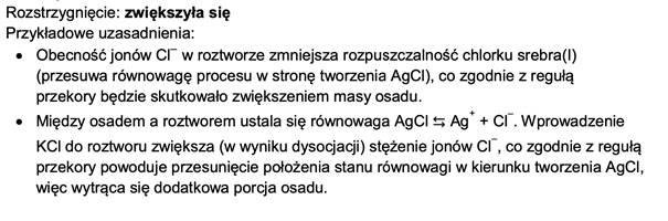 Określ, czy po dodaniu chlorku potasu do otrzymanej mieszaniny masa osadu w zlewce wzrosła, zmalała, czy pozostała bez zmian. Uzasadnij swoją odpowiedź, odnosząc się do równowagi chemicznej zachodzącej w roztworze.