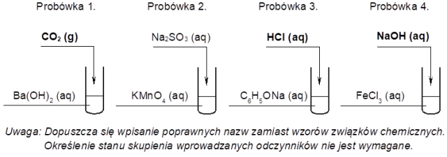 Zdecyduj, do której z probówek musiał zostać wprowadzony CO2, a do których wodne roztwory NaOH i HCl. W tym celu uzupełnij przedstawione schematy.