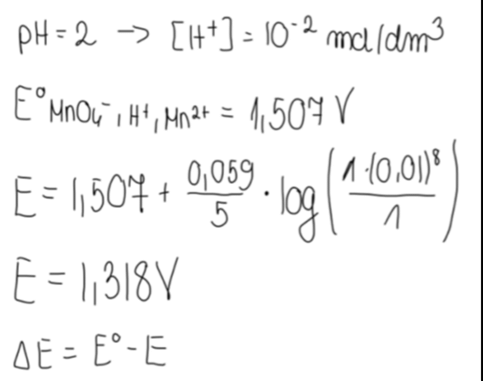 Wyznacz, jak zmieni się potencjał redukcji układu MnO4- do Mn²⁺, gdy pH roztworu wzrośnie do 2, przyjmując warunki standardowe dla wszystkich rozpuszczalnych reagentów (stężenie 1 mol/dm³).
