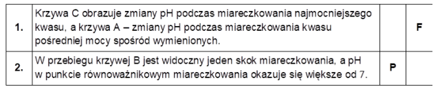 Zdanie 1. jest fałszywe, ponieważ krzywa A obrazuje zmiany pH podczas miareczkowania kwasu najniższej mocy spośród wymienionych.