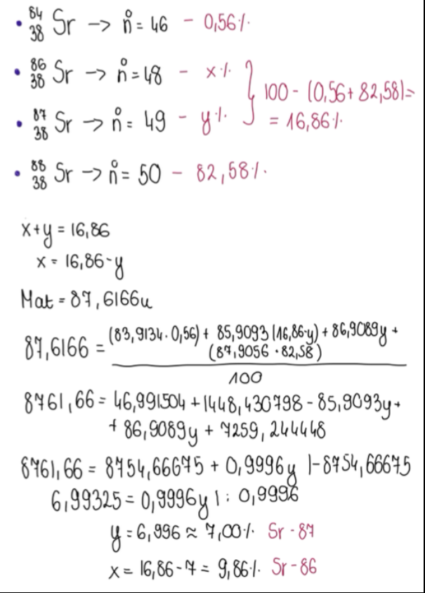 Oblicz procentowy udział pozostałych izotopów, wiedząc, że średnia masa atomowa strontu wynosi 87,6166 u. Odpowiedzi podaj z dokładnością do dwóch miejsc po przecinku.