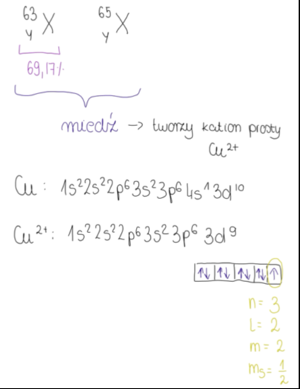 Przepisz tabelę do zeszytu i uzupełnij ją, wpisując wartości liczb kwantowych opisujących stan kwantowy niesparowanego elektronu w kationie prostym pierwiastka X.