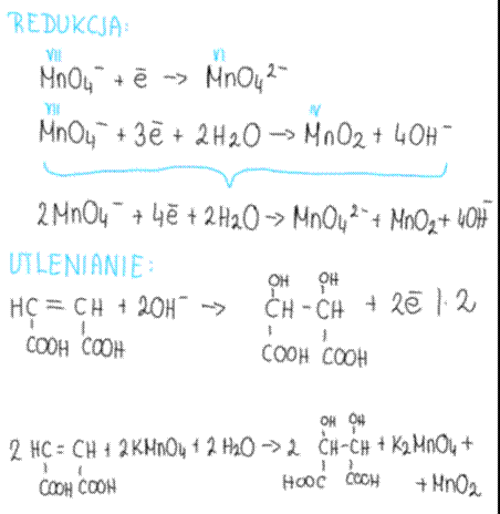 Napisz równania reakcji redukcji i utleniania w formie jonowej, uwzględniając liczbę przekazywanych elektronów (zapis jonowo-elektronowy), które zachodzą podczas reakcji kwasu maleinowego z odczynnikiem Bayera [Bajera], bazując na poniższym schemacie. Ustal odpowiednie współczynniki stechiometryczne w zapisanych równaniach reakcji.