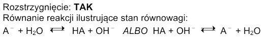 Ustal, czy podany wniosek jest prawdziwy, a swoją odpowiedź uzasadnij, pisząc w napisz w formie jonowej skróconej równanie reakcji ilustrujące równowagę, która ustaliła się w punkcie równoważnikowym, używając ogólnego wzoru kwasu HA.