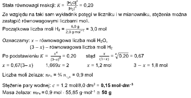 Oblicz stężenie pary wodnej w reaktorze, jakie było po ustaleniu się stanu równowagi oraz masę otrzymanego żelaza.