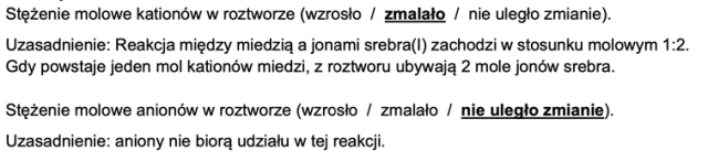 Ustal, czy podczas przeprowadzonego doświadczenia sumaryczne stężenie molowe kationów oraz sumaryczne stężenie molowe anionów się zmieniły (wzrosły albo zmalały), czy też nie uległy zmianie- w tym celu uzupełnij zdania i uzasadnij swoją odpowiedź.