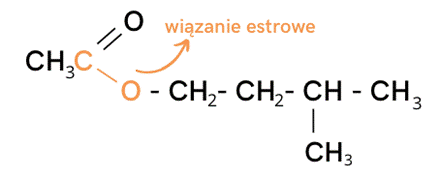 Wiązanie estrowe tworzy się pomiędzy grupą pochodzącą od kwasu (tu: kwasu etanowego) a wodorem grupy hydroksylowej alkoholu (tu: 3-metylobutan-1-olu).