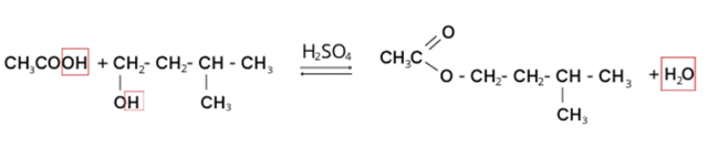 W naszym zadaniu powstaje octan 3-metylobut-1-ylu. Oznacza to, że substratami reakcji są: kwas octowy i 3-metylobutan-1-ol. Spójrz na ramki, by dowiedzieć się, skąd bierze się cząsteczka wody jako produkt uboczny: