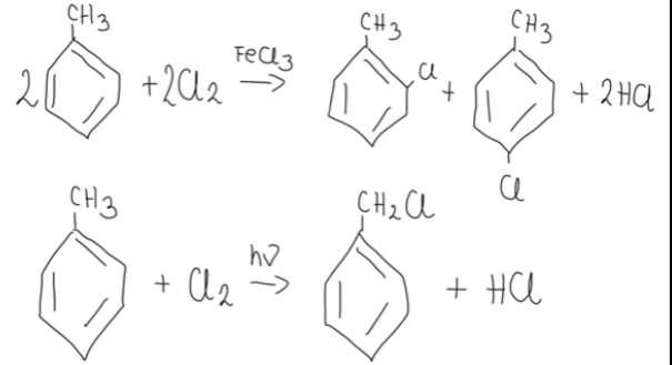Związek I to 1-chloro-2-metylobenzen. Związki I i II są w stosunku do siebie izomerami. Z toluenu w reakcji substytucji można otrzymać oba związki. Chlorowanie związku I w obecności FeCl₃ spowoduje wymianę atomu wodoru przyłączonego do atomu węgla o hybrydyzacji sp² na atom chloru.