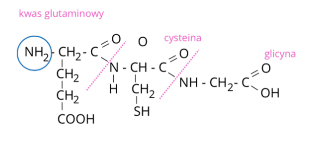 Na graficeprzedstawionotripeptyd z uwzględnieniemaminokwasów, od których pochodzą poszczególne fragmenty. W kółko zaznaczono wolnągrupęaminowąglutationu – pochodziona od kwasu glutaminowego.