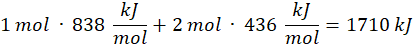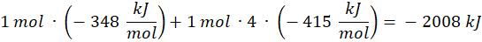 Odczytujemy wartości energii wiązań z tabelki. Aby przerwać wiązanie, musimy dostarczyć ciepło do układu (dodatnia wartość energii wiązania), natomiast, aby je stworzyć, ciepło jest oddawane do otoczenia (ujemna wartość energii wiązania). Tam, gdzie wiązania są rozrywane, wstawiamy znak „+” przed wartością z tabelki a tam, gdzie tworzone wstawiamy znak „-” przed wartością z tabelki. Musimy pamiętać, żeby wymnożyć ową wartość przez całkowitą liczbę wiązań biorących udział w reakcji tj. współczynnik stechiometryczny z jednostką mol i liczbę wiązań w danym związku. Sumujemy wyniki, otrzymując odpowiedź.