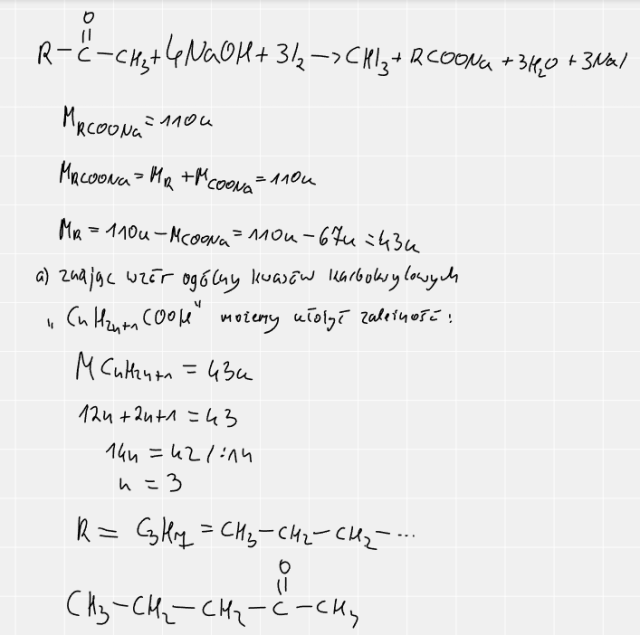 W tym zadaniu musisz ustalić wzór sumaryczny nasyconego ketonu, który poddano próbie jodoformowej, wiedząc, że masa cząsteczkowa otrzymanej soli kwasu karboksylowego wynosi 110u. Wykonaj obliczenia. Narysuj jego wzór półstrukturalny i podaj nazwę systematyczną.