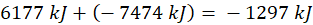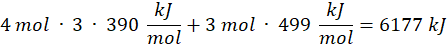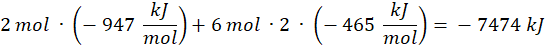 Odczytujemy wartości energii wiązań z tabelki. Aby przerwać wiązanie, musimy dostarczyć ciepło do układu (dodatnia wartość energii wiązania), natomiast, aby je stworzyć, ciepło jest oddawane do otoczenia (ujemna wartość energii wiązania). Tam, gdzie wiązania są rozrywane, wstawiamy znak „+” przed wartością z tabelki a tam, gdzie tworzone wstawiamy znak „-” przed wartością z tabelki. Musimy pamiętać, żeby wymnożyć ową wartość przez całkowitą liczbę wiązań biorących udział w reakcji tj. współczynnik stechiometryczny z jednostką mol i liczbę wiązań w danym związku. Sumujemy wyniki, otrzymując odpowiedź.