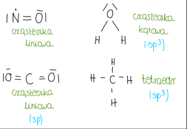 | Rodzaj hybrydyzacji | Liczba wiązań s tworzonych przez atom centralny | Liczba wolnych par elektronowych na atomie centralnym | Kształt cząsteczki |