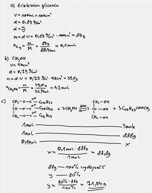 Komentarz: Ilość powstałego produktu obliczamy z tego substratu, którego był niedomiar. W tym zadaniu od razu widać, że niedomiar był triolenianu glicerolu. W trudniejszych przykładach należy podstawić do proporcji zadaną ilość moli substratu i obliczyć, czego faktycznie był niedomiar.